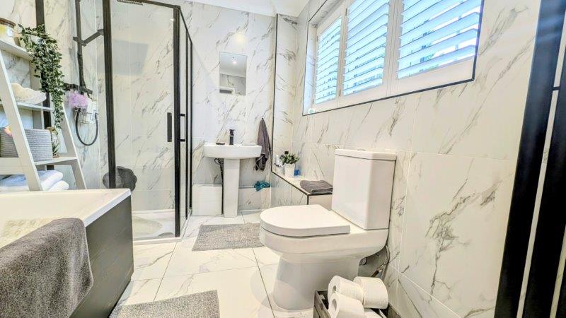 REFITTED BATH / SHOWER ROOM panel bath, tiled shower cubicle, low-level wc, pedestal wash hand basin, vertical radiator, uPVC double glazed window with fitted shutter, tiled walls, tiled floor