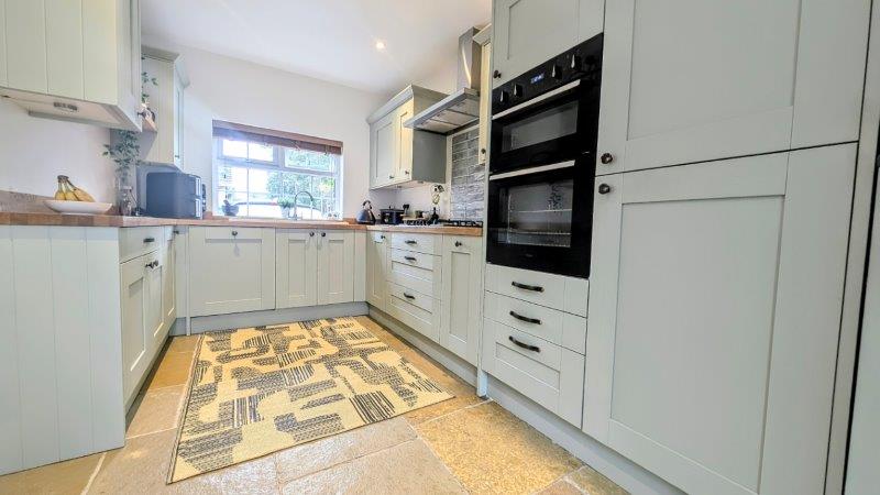REFITTED KITCHEN 4.68m x 2.46m, one and a quarter ceramic bowl sink unit, excellent range of Shaker-style wall, base and drawer units incorporating a corner larder cupboard, fitted timber work surfaces, built-in five-burner gas hob with fitted stainless steel extractor hood over and built-in oven below, built-in fridge and freezer, built-in dishwasher, uPVC double glazed window, uPVC double glazed door to rear garden, stone floor