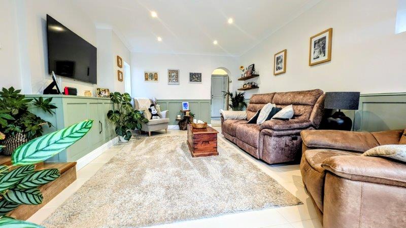 LIVING ROOM 5.08m x 3.81m, double aspect, two uPVC double glazed windows, colour-washed panelling, tiled floor with underfloor heating, archway to kitchen, uPVC double glazed French doors and side panels to