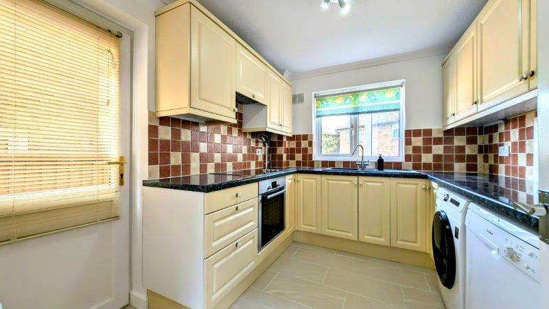 KITCHEN 2.95m x 2.49m, one and a half bowl sink unit with mixer tap and cupboard below, matching wall, base and drawer units with fitted dark granite-effect laminated work surfaces over, built-in ceramic hob with fitted extractor hood over and Bosch fan-assisted oven below, space and plumbing for washing machine, space and plumbing for dishwasher, integrated fridge fridge / freezer, wall-mounted gas-fired combination boiler for domestic hot water and central heating, uPVC double glazed window, uPVC double glazed door to side, part-tiled walls, tiled floor