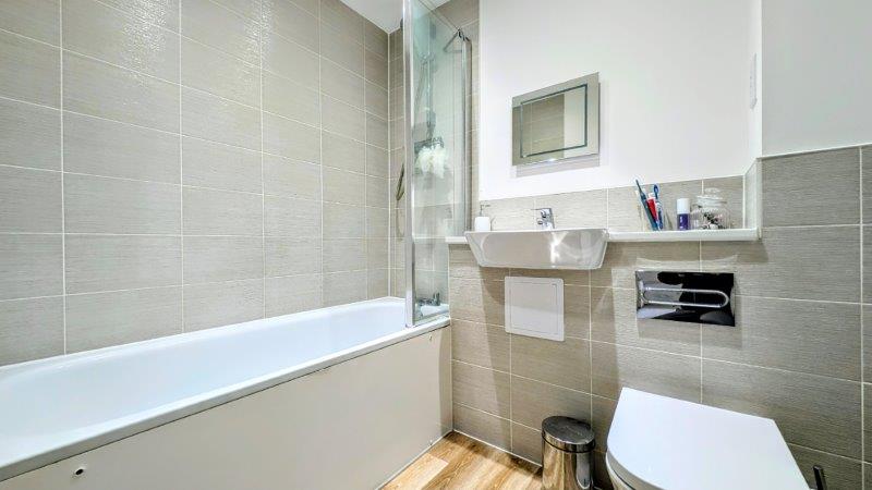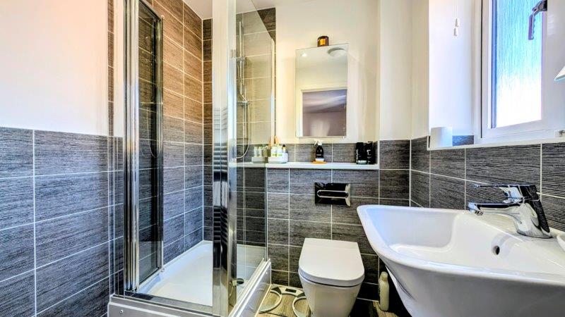 REFITTED SHOWER ROOM shower cubicle with wall-mounted Triton T80 power shower, wall-mounted wash hand basin with cupboard below, dual-flush low-level wc, single radiator, part-tiled walls, double glazed Velux window