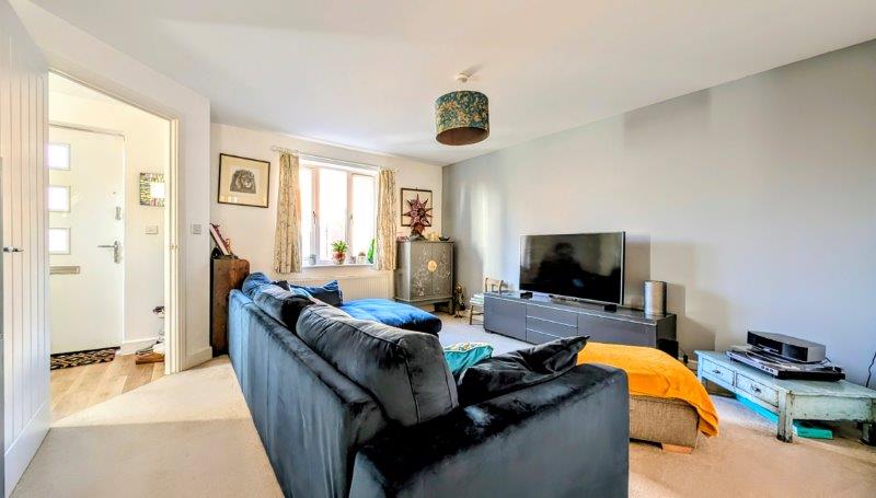 FRONT GARDEN open plan, paved path to entrance door, off-road parking for two cars