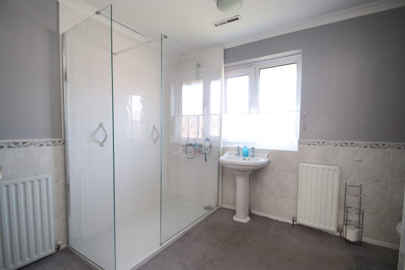 FAMILY BATHROOM 10ft 5 (3.17m) reducing to 8ft 3 (2.53m) x 10ft (3.05m) reducing to 8ft 5 (2.56m) westerly facing rear aspect room via frosted double glazed window, three piece suite comprising walk-in shower area with two tiled walls glazes screen, chrome shower mixer, pedestal wash hand basin with chrome taps and tiled splashback, close coupled wc, storage cupboard, panelled radiator, tiling to all walls to dado level.