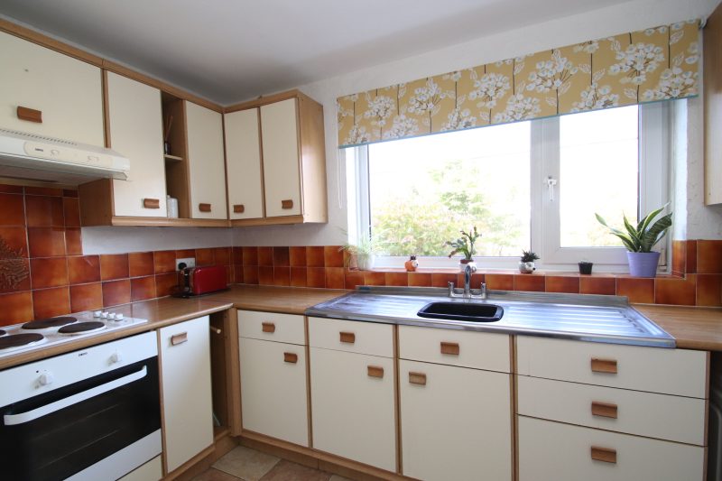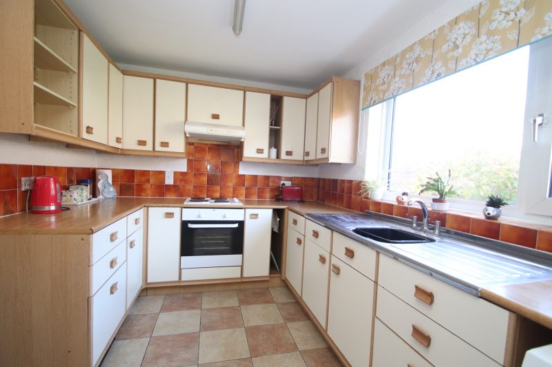 KITCHEN 12ft 10 (3.92m) x 8ft 5 (2.57m) rear aspect westerly facing room via double glazed window overlooking lawned garden, kitchen comprising single bowl double drainer stainless steel sink unit with chrome taps over, wood effect roll edge work surfaces with tiled splashback, range of storage cupboard and drawers under, further range of matching high level cupboards with under and over pelmet, built-in electric oven with four ring electric hob and cooker hood over, space for freestanding fridge/freezer, space for washing machine, door leading to inner lobby with access to integral garage and ground floor w.c.