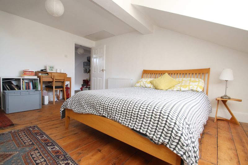 BEDROOM 2 16ft 8 (5.09m) x 14ft 3 (4.34m) easterly facing front aspect room via period style sash window with views down Brougham Road, central chimney breast with period mantle and surround, decorative cast iron back and grate, slate hearth, natural wood exposed period floorboards, panelled radiator, plain plastered part sloping ceiling to dormer window, access to roof space via pull down ladder.