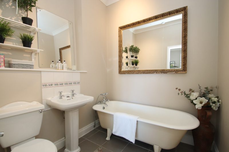 ENSUITE 6ft 6 (1.99m) x 6ft 9 (2.05m) standalone roll top cast iron bath with chrome bath/shower mixer, pedestal wash hand basin with chrome taps and tiled splashback, close coupled wc, panelled radiator, tiled flooring, extractor fan.