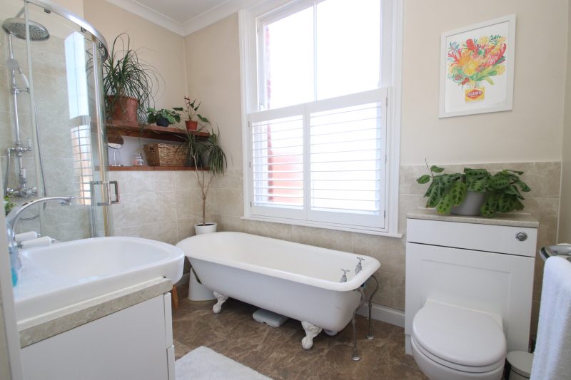 FAMILY BATHROOM 9ft 9 (2.98m) x 6ft 7 (2.01m) plus deep entrance recess, rear aspect westerly facing room via frosted period sash window, built-in louvered window shutters, four piece suite comprising cast iron roll top bath with chrome taps, close coupled wc with concealed cistern, marble effect work surface over, ceramic wash hand basin with chrome monobloc mixer tap and pop-up waste, marble effect work surfaces, white shaker design panel effect storage cupboards with pewter effect furniture below, stone effect tiled splashback, corner shower cubicle with two stone effect tiled walls, curved glazed doors/screen, chrome shower mixer with separate hand held shower head and principle sunflower shower head over, feature roll top radiator with chrome towel rail, tiled flooring, coved and plain plastered ceiling with inset ceiling spotlights.