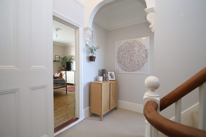 FIRST FLOOR Georgian style wood grain panel effect doors to master bedroom and family bathroom, built-in storage cupboard via panelled doors, period decorative plaster arch, coved and plain plastered ceiling, natural wood period banister and staircase rising to second mezzanine level and second floor.