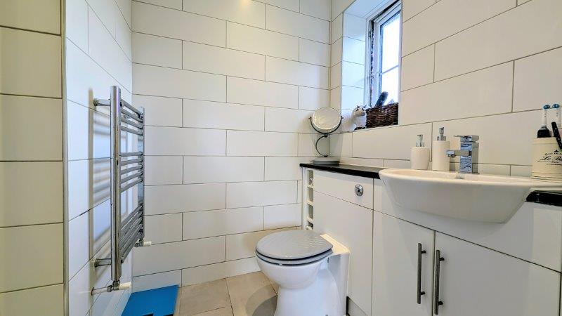 ENSUITE SHOWER ROOM tiled shower cubicle, inset wash hand basin with cupboard below, concealed-cistern low-level wc, ladder radiator, uPVC double glazed window