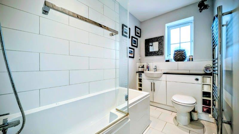 FAMILY BATHROOM panel bath, shower screen, inset wash hand basin with cupboards below, concealed-cistern low-level wc, ladder radiator, uPVC double glazed window