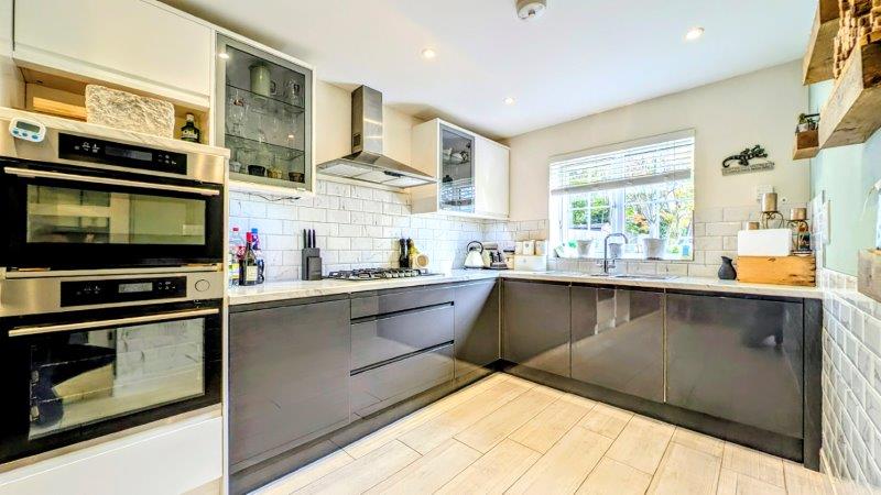 KITCHEN / DINING ROOM 6.22m x 3.88m narrowing to 2.49m, double aspect, one and quarter bowl sink unit, range of grey and white hi-gloss wall, base and drawer units incorporating two wall-mounted glass-fronted cupboards and larder cupboard, fitted work surfaces over, built-in five-ring gas hob with fitted extractor hood over, built-in double oven, built-in dishwasher, built-in fridge and freezer, built-in washing machine, two uPVC double glazed windows, radiator, under-stairs storage cupboard, Vaillaint gas-fired boiler, double doors to