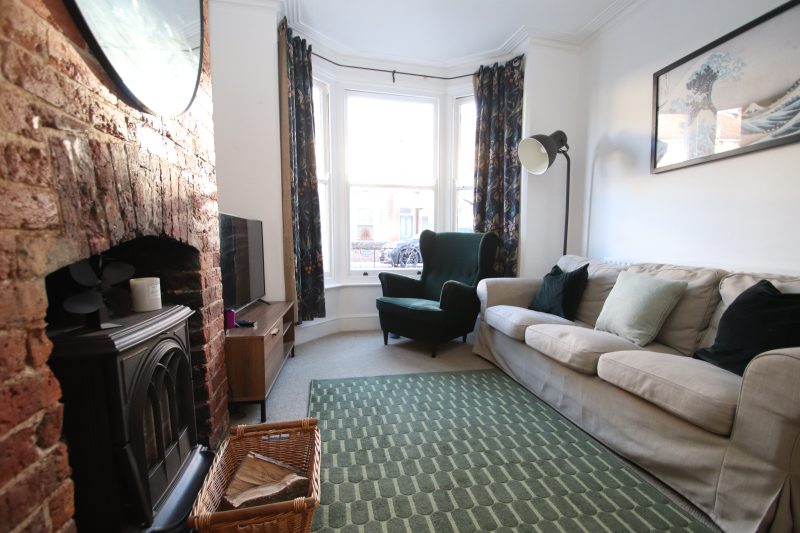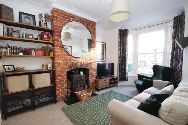 LOUNGE 12ft (3.64m) x 10ft (3.04m) plus front aspect bay window with period style sashes, central exposed brick chimney breast with logging burning stove, panelled radiator, period skirting boards, coving and decorative ceiling rose.