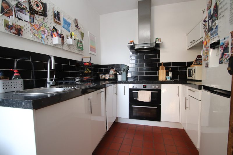 KITCHEN 12ft 9 (3.90m) reducing to 10ft (3.07m) x 7ft 9 (2.37m) reducing to 4ft (1.21m) rear aspect room via part panelled part frosted double glazed door leading to rear garden, kitchen comprising white high gloss units with brushed steel effect furniture, granite effect work surfaces with tiled splashback, range of storage cupboards and drawers under, further eyelevel storage cupboards, space for washing machine, space for freestanding fridge/freezer, built-in brushed steel electric oven and grill with four ring electric hob and brushed steel cooker hood over, panelled radiator, tiled flooring, wall mounted boiler.