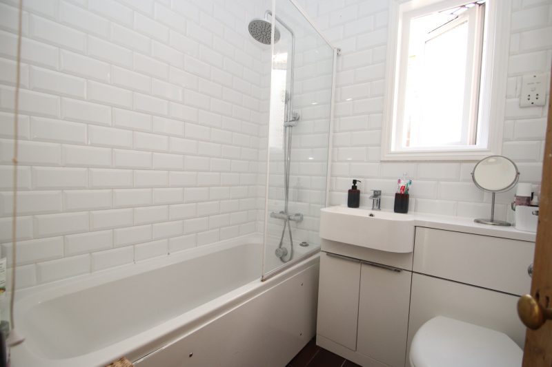 BATHROOM White three piece suite comprising panel enclosed bath, chrome bath and shower mixer, separate hand held shower head, principle sunflower shower head over, glazed screen, white bevel edge tiled surround, wash hand basin built into work surface with chrome monobloc mixer tap, white high gloss storage cupboards below, adjacent close coupled wc with concealed cistern, shaver point, frosted side aspect double glazed window.