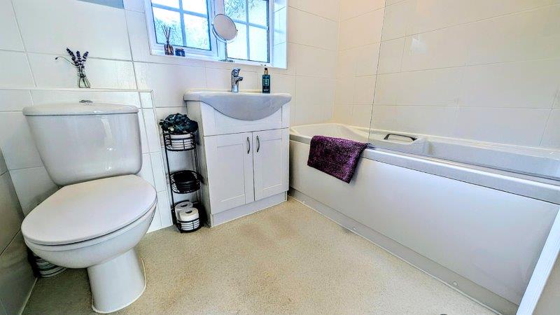 REFITTED BATHROOM panel bath with shower attachment, inset wash hand basin with cupboard below, low-level wc, uPVC double glazed window, radiator