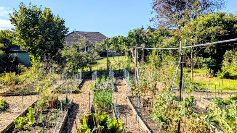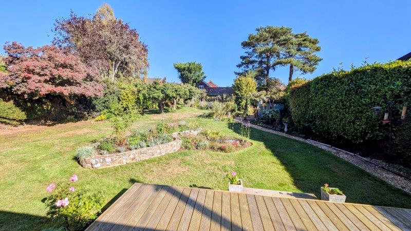 REAR GARDEN beautifully maintained, raised timber decking, area of formal lawn with inset fish pond and raised flower bed behind, pebble pathway, two Bramley apple trees, two eating apple trees, Laurel hedge, conifer hedge, timber summerhouse, greenhouse, timber garden shed, productive vegetable plot
