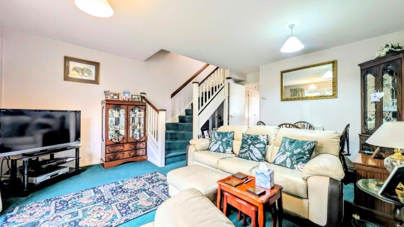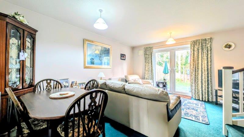 LIVING ROOM 4.56m x 4.18m, uPVC double glazed French doors to rear garden, two double radiators, telephone point, tv point, under-stairs recess, stairs to landing