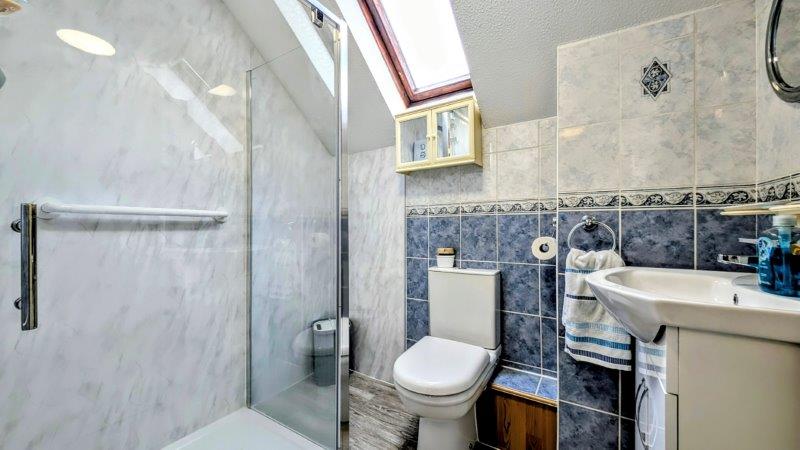 REFITTED SHOWER ROOM shower cubicle with wall-mounted Triton T80 power shower, wall-mounted wash hand basin with cupboard below, dual-flush low-level wc, single radiator, part-tiled walls, double glazed Velux window