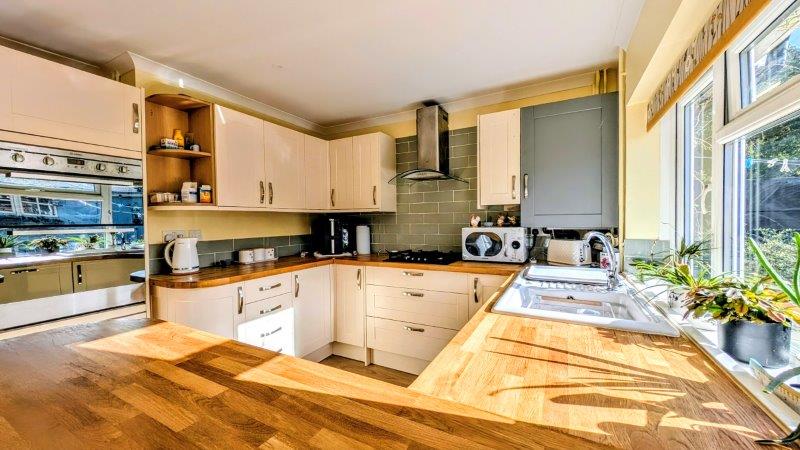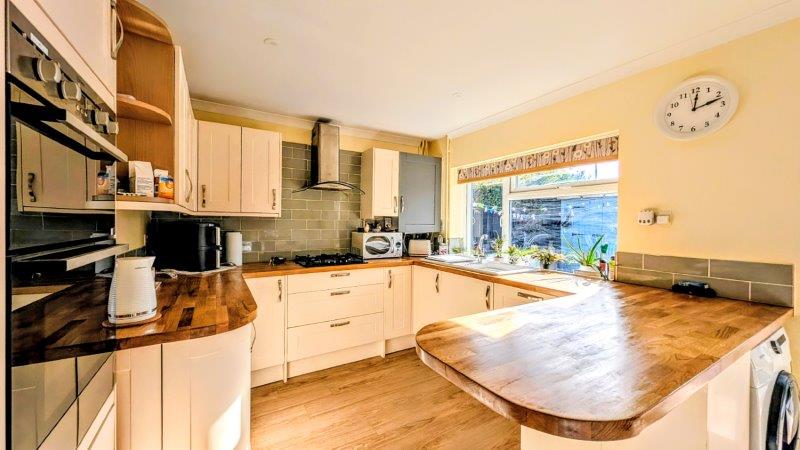 REFITTED KITCHEN 3.62m x 4.38m, ceramic single bowl sink unit, range of wall, base and drawer units with fitted timber work surfaces over, inset four-ring gas hob with fitted stainless steel extractor hood over, built-in double oven, fitted dishwasher, space for fridge / freezer, larder cupboard, space and plumbing for washing machine, breakfast bar, wall-mounted gas-fired combination boiler for domestic hot water and central heating, radiator, uPVC double glazed window, uPVC double glazed French doors to rear garden