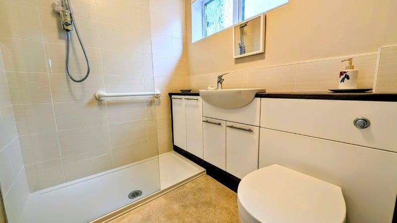 REFITTED SHOWER ROOM double shower cubicle with shower unit and attachment, part inset wash hand basin with cupboards below, concealed-cistern low-level wc, base cupboards, radiator, uPVC double glazed window