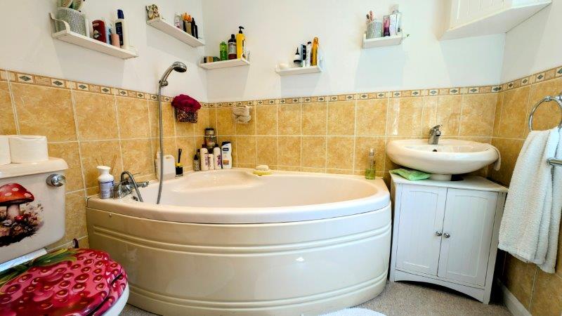 ENSUITE BATHROOM corner panel bath, low-level wc, pedestal wash hand basin, uPVC double glazed window, radiator, extractor fan